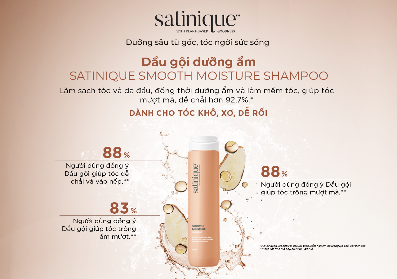 Satinique Smooth Moisture Shampoo không chỉ làm sạch tóc và da đầu dịu nhẹ mà còn bổ sung độ ẩm sâu, phục hồi độ bóng mượt cho mái tóc khô xơ. Được phát triển với công nghệ PhytoJuve độc quyền, sản phẩm mang lại hiệu quả: