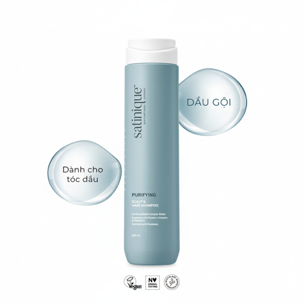 Satinique Purifying Scalp & Hair Shampoo là dầu gội chuyên biệt cho tóc dầu, được phát triển với công thức thuần chay, lành tính và giàu dưỡng chất thực vật. Sản phẩm không chỉ làm sạch sâu mà còn bảo vệ da đầu và phục hồi tóc khỏe mạnh, phù hợp cho cả tóc nhuộm và da đầu nhạy cảm.