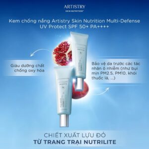Kem chống nắng Artistry Skin Nutrition Multi-Defense UV Protect PF50+ với chỉ số SPF50+, PA++++ giúp bảo vệ da hiệu quả trước tác hại từ tia nắng mặt trời (UVA, UVB), ánh sáng xanh, tia hồng ngoại và các tác nhân ô nhiễm từ môi trường (bao gồm cả bụi mịn PM2.5). Đồng thời, hỗ trợ tăng cường bảo vệ da khi được bổ sung thành phần Carnosine Peptides cùng khả năng chống nước lên đến 80 phút (tùy theo độ ẩm của môi trường).
