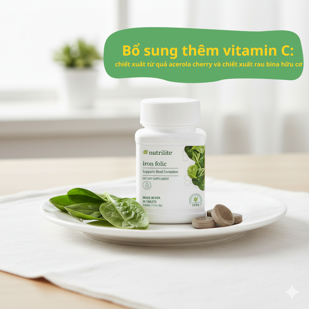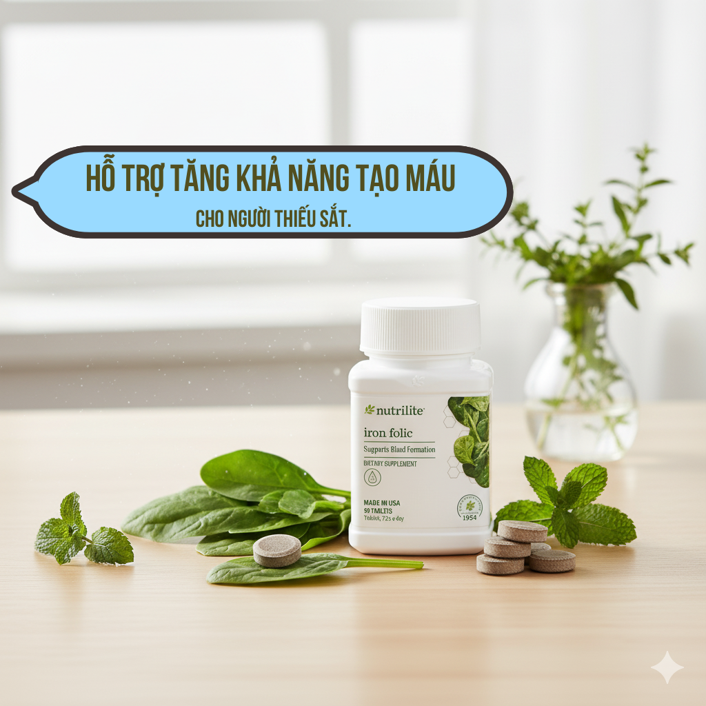 Nutrilite™ Iron Folic là thực phẩm bảo vệ sức khỏe hỗ trợ tăng khả năng tạo máu nhờ sự kết hợp 3 nguồn sắt đa dạng cùng acid folic và vitamin C tự nhiên. Sản phẩm đặc biệt phù hợp cho người thiếu máu do thiếu sắt, phụ nữ, trẻ em từ 9 tuổi trở lên và người trưởng thành có nhu cầu bổ sung sắt.
